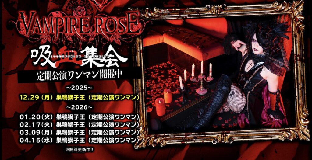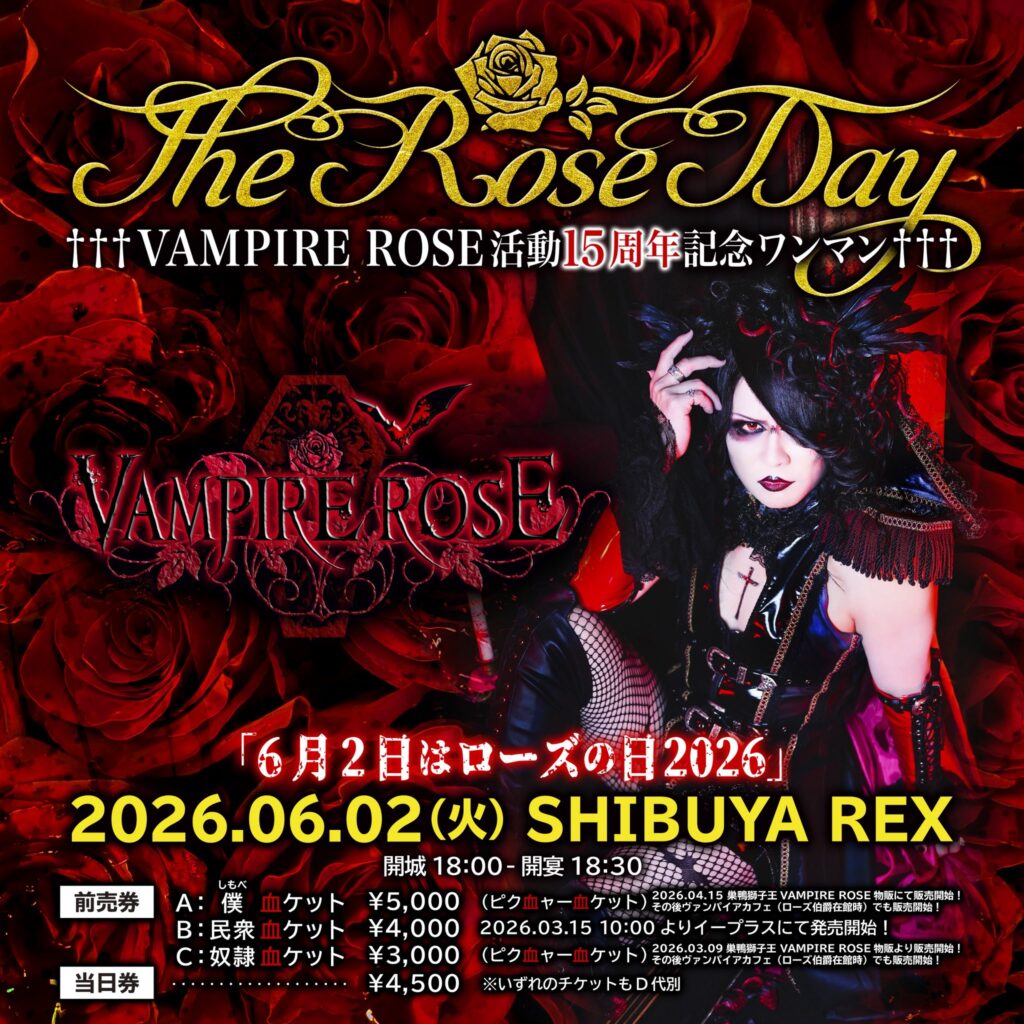 VAMPIRE ROSE活動15周年記念ワンマン~6月2日はローズの日2026~ 00日 00時間 00分 00秒 次のVAMPIRE ROSEライブ 説明しよう!! VAMPIRE ROSEとは銀座レストラン ヴァンパイアカフェの主、ローズ伯爵が吸血鬼による世界制圧の為に覚醒したソロプロジェクト!! 普段はヴァンパイアカフェで飲食業をやっておるぞ! そう、VAMPIRE ROSE(ローズ伯爵)は会いにいけるヴァンパイアなのだ! BUY DVD